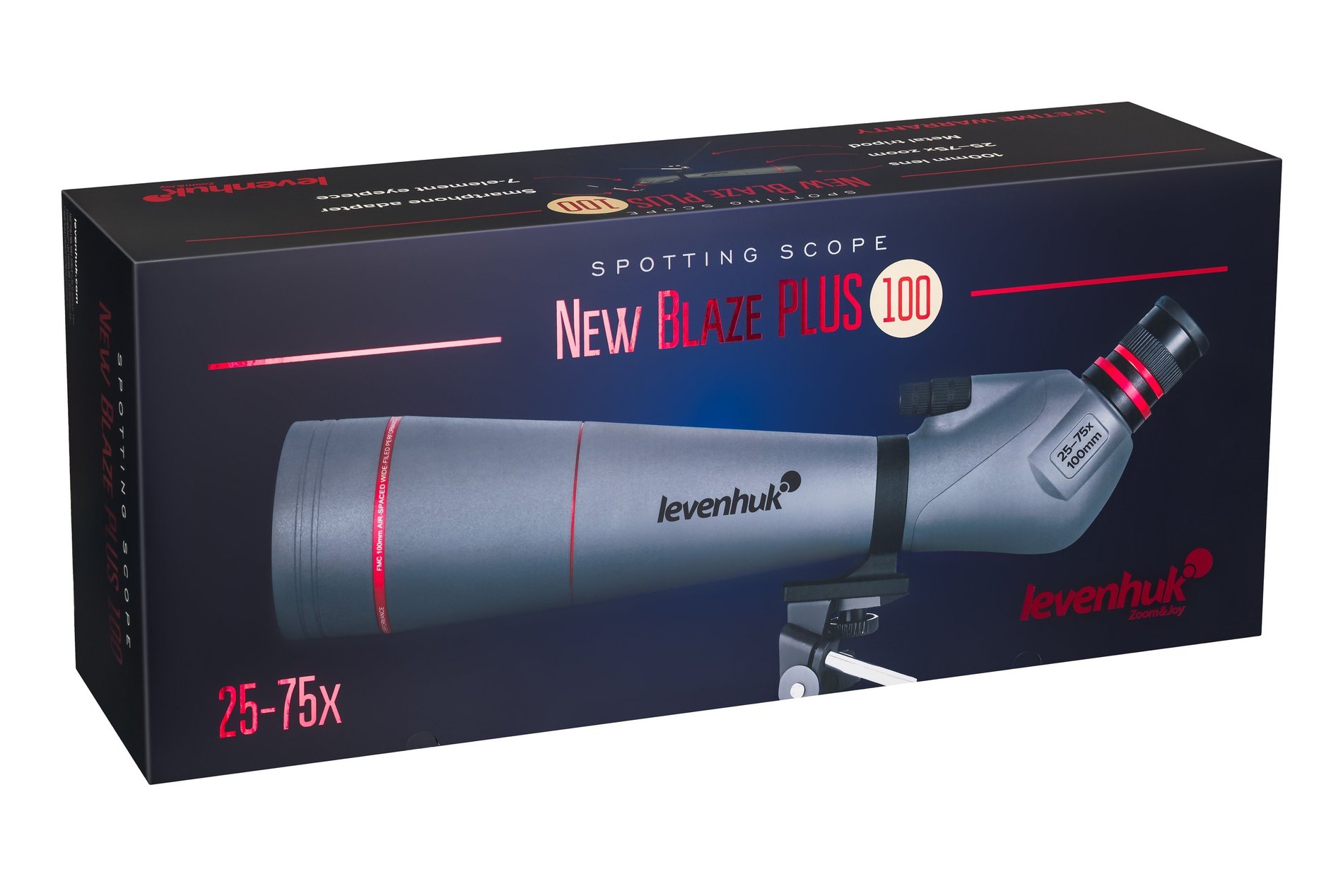 Levenhuk New Blaze PLUS 100 je vysoce výkonný pozorovací dalekohled se stativem, adapterem pro fotografování a výkonným zoomem 25–75x. Je určen pro pozorování na extrémně dlouhé vzdálenosti. Toto optické zařízení je cenným nástrojem pro lovce, výzkumníky divoké přírody, odborníky na námořní a pozemní bezpečnost a astronomické nadšence, jelikož umožňuje detailní pozorování Měsíce a jasných planet. Objektiv se světelností 100 mm v kombinaci s vícenásobnou antireflexní vrstvou na všech optických prvcích poskytuje jasný, kontrastní a detailní obraz i při maximálním zvětšení.